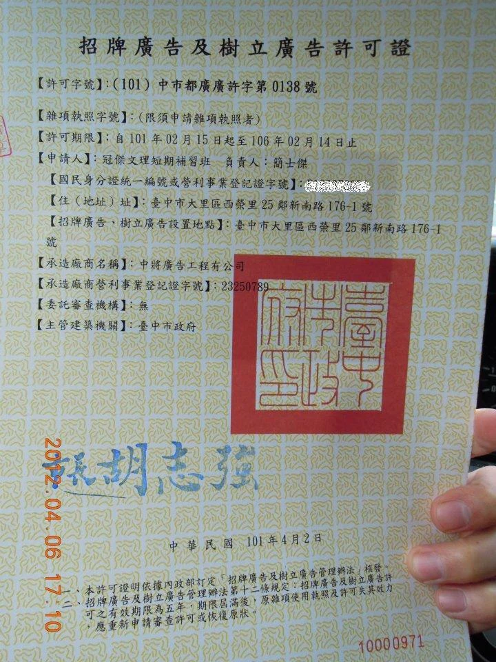 #台中許可證#招牌維護#合格招牌#安全招牌#招牌合格證#廣告物申請#廣告雜項#招牌整修#補習班招牌#合法招牌